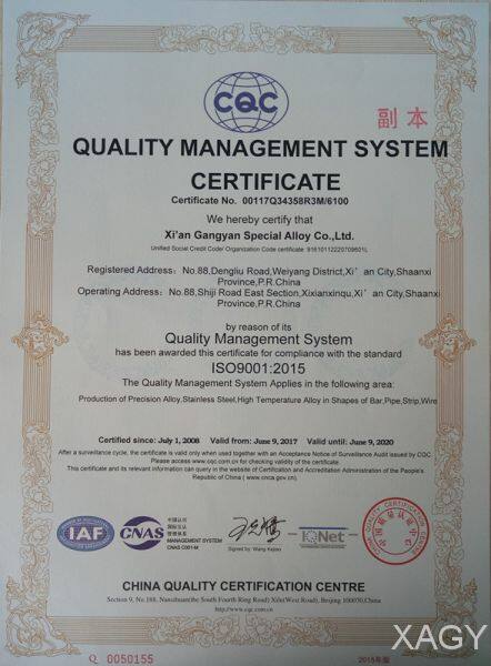 XI`AN GANGYAN SPECIAL ALLOY CORPORATION (XAGY) специализируется на производстве высококачественных сплавов уже 25 лет. Компания стремится предоставлять высококачественные и надежные источники точных сплавов, высокотемпературных сплавов и нержавеющей стали как в опытном производстве, так и в массовом производстве. Мы специализируемся на производстве материалов с уникальными характеристиками, которые затем используются в аэрокосмической, военной, электронной, морской, нефтяной и нефтехимической промышленностях. Теперь наша компания официально размещена на новом фондовом рынке Китая, номер акции - 836660.